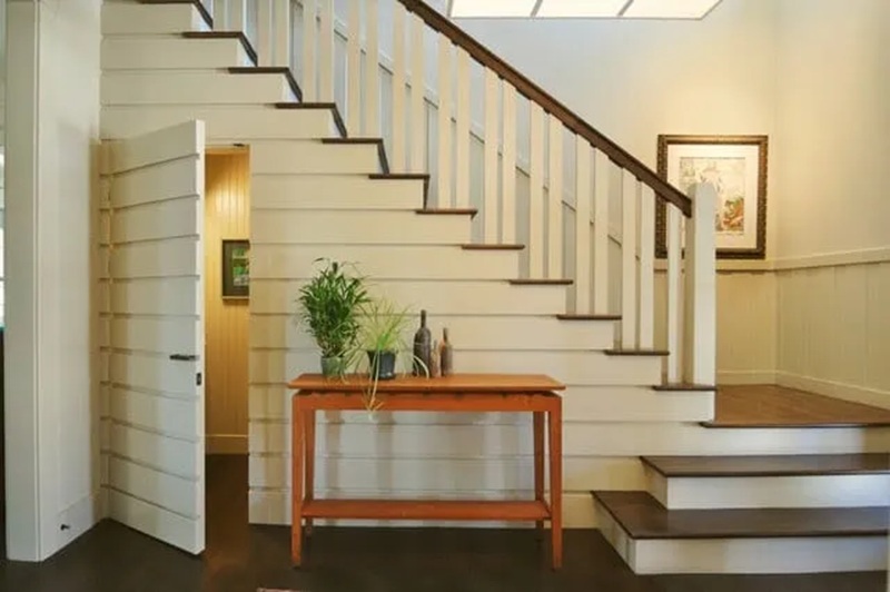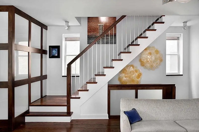 Selain itu, bagian bawah lebih lebar dari anak tangga atas untuk menampilkan bentuk yang mirip seperti tangga luar ruangan. Desain tangga ini mampu membuat hunian terlihat lebih luas dari ukuran sesungguhnya.