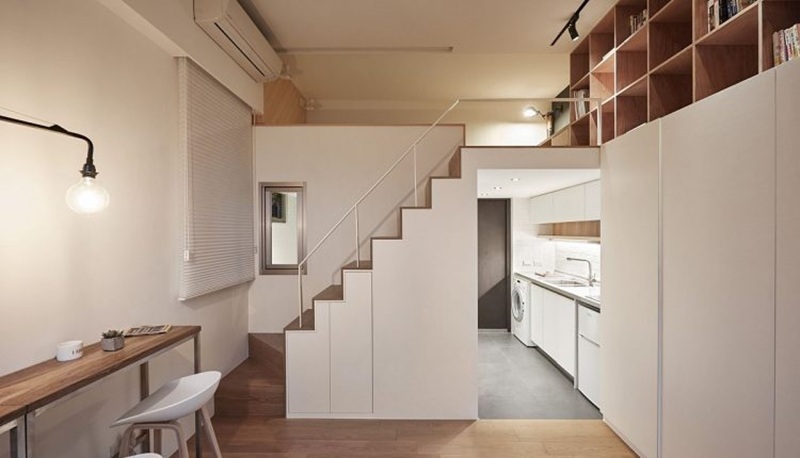 Konsep ini ideal untuk apartemen studio atau rumah kecil yang membutuhkan solusi fungsional. Desain tangga ini menjadi elemen multifungsi yang membantu menjaga rumah tetap rapi.